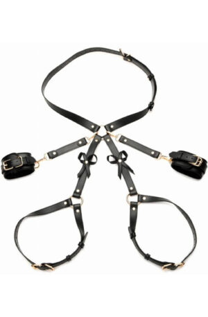 The use of your body is a gift; treat it like one with this bondage harness and wrap up your waist, thighs and wrists like a nice, little package -it even has bows included! Made out of durable PU faux leather, it is vegan friendly and easy to spot clean or wipe clean after each use. The wrist cuffs close using nickel-free, gold colored metal buckles. Adjust the buckles on the thigh straps, waist strap and wrist cuffs for a custom and comfortable fit. Accentuate your curves and make your partner drool with lust and desire as you present yourself as the object of their admiration, a bound and submissive playmate ready to spice up the night!