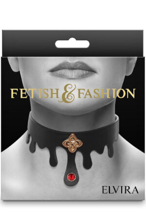 The Elvira Collar is decorated with a drip design as well as a ruby jewel and a gold-coloured pendant.