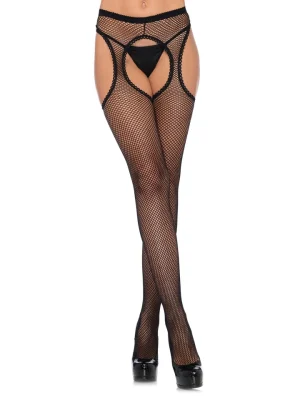 - Fishnet suspender hose with scalloped trim