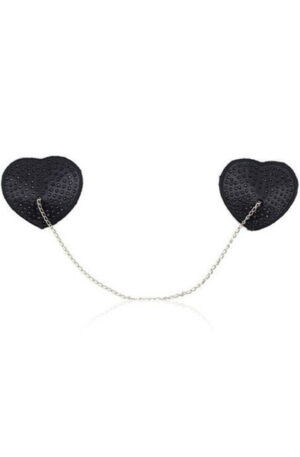 Heart-shaped nipple covers covered with black, sparkling rhinestone stones with a delicate silver chain from the Toyz4Lovers brand.