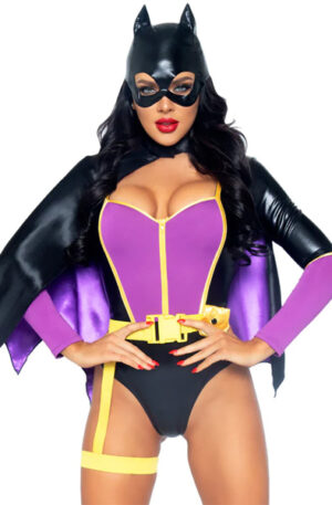 Gotham will be a saver place when you are around to clean up the villains. In this 4 Piece Bombshell Bat womens costume you will stand out. The costume features a long sleeved with plunging-V zip up bodysuit with snap crotch, belt with attached garter, bat ear skull cap in wetlook and metallic scalloped cape. The bodysuit has a sexy cheecky fit and contrasting bodice.