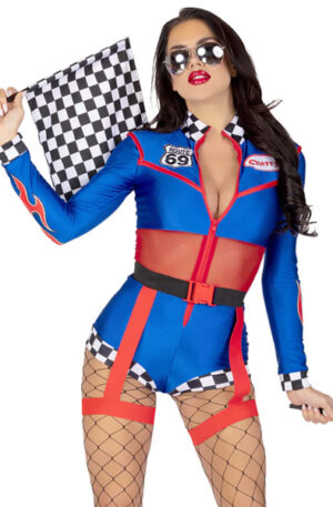 Light up any event with our 2 PC Cherry Bomb Racer set! Featuring a zip-up romper with sheer midriff and badge accents, flame detail, and checkerboard trim, plus a belt with attached garters. A perfect pick for costume parties or unleasing your wild side. Be daring and dynamic. Take life off the tracks and enjoy the exhilarating ride with the Cherry Bomb Racer set!