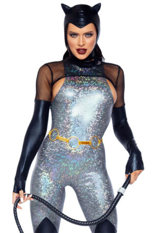 This is not a sweet kitty cat, but a true bad ass. This 4 Piece Feline Felon features a supercool and sexy holographic catsuit with faux boot detail, fishnet gloved shrug, cat ear skull cap and glitter belt in gold.
