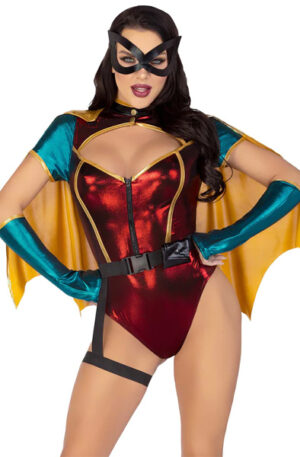 Get ready to unleash your inner superhero with our 5 PC Robin costume! Includes a shimmer zip-up bodysuit, detachable cape, belt with attached garter, gloves, and face mask. Embrace the spirit of Robin and protect the city with confidence and style. Perfect for costume parties or embracing your heroic side. Make a striking impression at any event with this unforgettable and iconic superhero outfit!