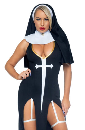 Our Sultry Sinner costume includes V-neck dress with slit and headpiece with vinyl detailing.