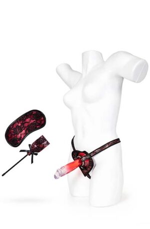 This luxury strap-on pleasure kit comes with a gorgeous 15.5 cm realistic dong with a suction cup, heart-shaped harness, eye mask, and a paddle. All in red with beautiful black lace.