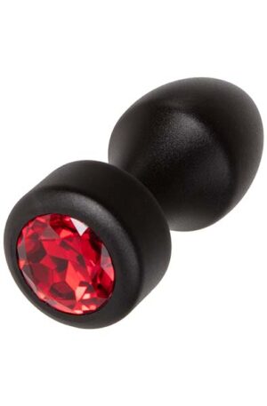 Gorgeous aluminum butt plug with a very elegant-looking black finish and a decorative romantic red stone in the base that sparkles beautifully. The metal plug is both easy and safe to use thanks to its tapered shape and thick flared base.