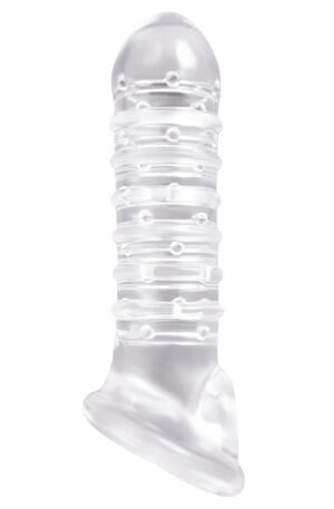 Ribbed externally for a lover’s enjoyment, the extension’s inner tunnel is lined with soft, jelly-like nubs to enhance user stimulation during sex.