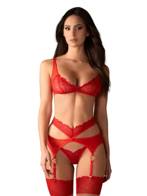 Modern design in sensual red for moments of closeness. The Cupide Desir set includes a bralette, thong, and garter belt with integral garter straps. Crafted from transparent mesh with delicate embroidery and adorned with gold heart-shaped accents and a minimalist pendant, it’s made to make you feel confident and feminine in any moment.