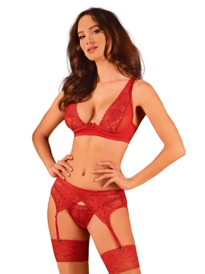 - A red set consisting of a bra, thong and garter belt