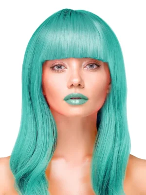 Long turquoise wig with straight hair and bangs.