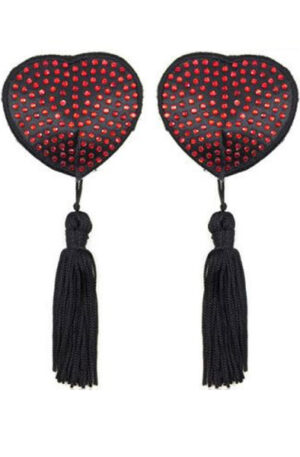 Heart-shaped nipple covers with sparkling rhinestones and black tassels from the Fetish Art collection by Toyz4Lovers.