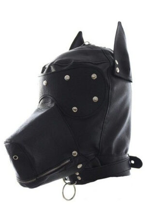 Dog-shaped hood made of black fake leather with zipper crossing the muzzle. Lacing in the back. Collar with studs and ring.