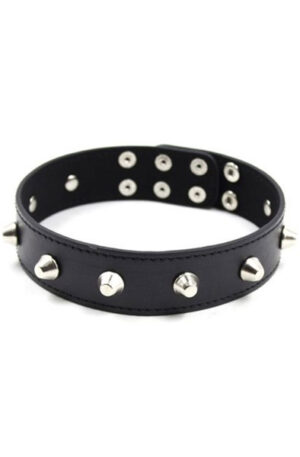 The necklace is adjustable and decorated with metal rivets