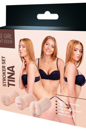 A set of 3 masturbators: pussy, anus and mouth. Tina is the Girl Next Door that turns you on! Each stroker has a super soft and realistic texture inside for exciting sensations, Tina offers you 3 penetration options! Made of long lasting, real-feel TPE, Tina offers a stretchable vagina, anus and mouth, each with an open ended love tunnel to accommodate all penis lengths and for easy cleaning. Body safe, free of phthalates and latex.