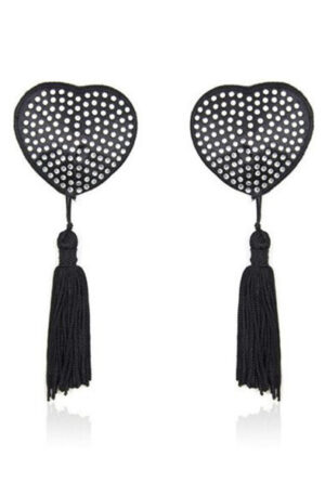 Heart-shaped nipple covers with golden rhinestones and black ribbons. A product of the Fetish Art line of Toys4Lovers .