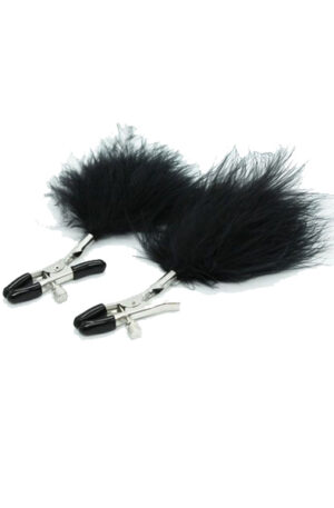 - Adjustable nipple clamps equipped with soft, black feathers
