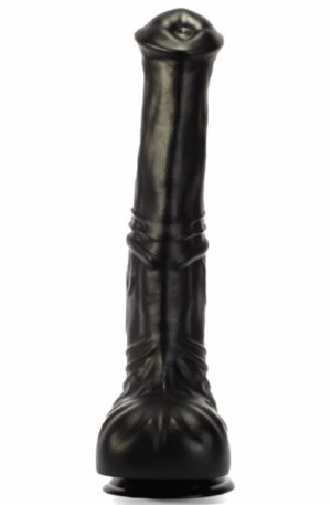 High-quality, uniquely designed dildo with a skin-like feel, made of a body tissue-like material, without a motor, with a veined surface and with added testicles. Its suction cup can be attached to a flat surface.
